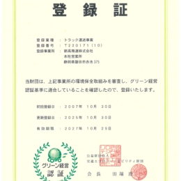 グリーン経営認証を更新しました