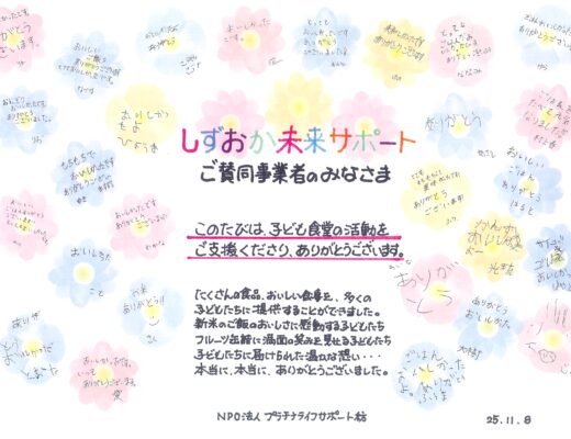 静岡銀行が定期預金の残高に応じて、静岡県内のこども食堂や学習支援など、子供たちの居場所づくりに関する団体または基金に寄付する社会貢献寄付型定期預金「しずおか未来世代サポート2025」のキャンペーンを実施、本件の趣旨に賛同し、定期預金を作成しました。 特典として、子供食堂や学習支援などを利用した子ども達からの心温まる寄せ書きを頂きました。 トランスポ […]