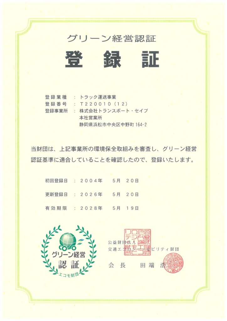 トランスポート・セイブは、グリーン経営認証を更新しました。