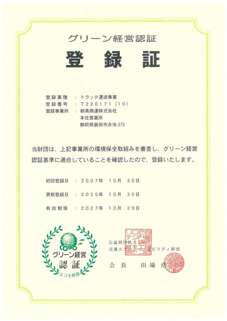 新高商運株式会社は、グリーン経営認証を更新いたしました。