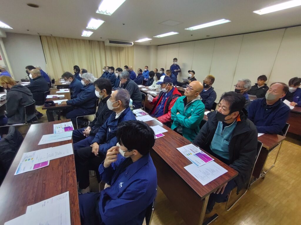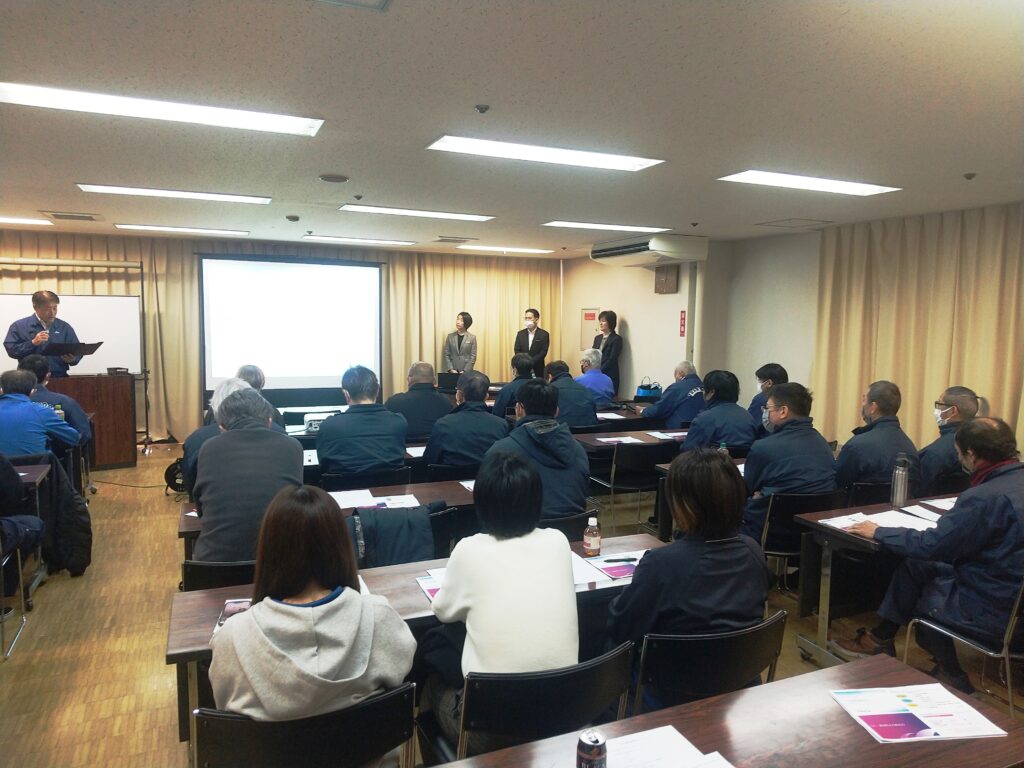 2026.02.09 2025年度 第2回 トランスポートオオスギグループ全体研修会を開催しました。 2月7日(土) 浜松市総合産業展示館 研修室を会場として、東京海上日動火災保険株式様より講師を招き、社員46名が参加しました。当日は『無事故を目指して!』をテーマとした内容で ≪ 危険性を理解する・行動を理解する・やる気を継続する ≫ を目的としました。社員ひとり一人が事故の発生リスクを理解し安全運転・安全作業に心掛けます。 DSC_0135